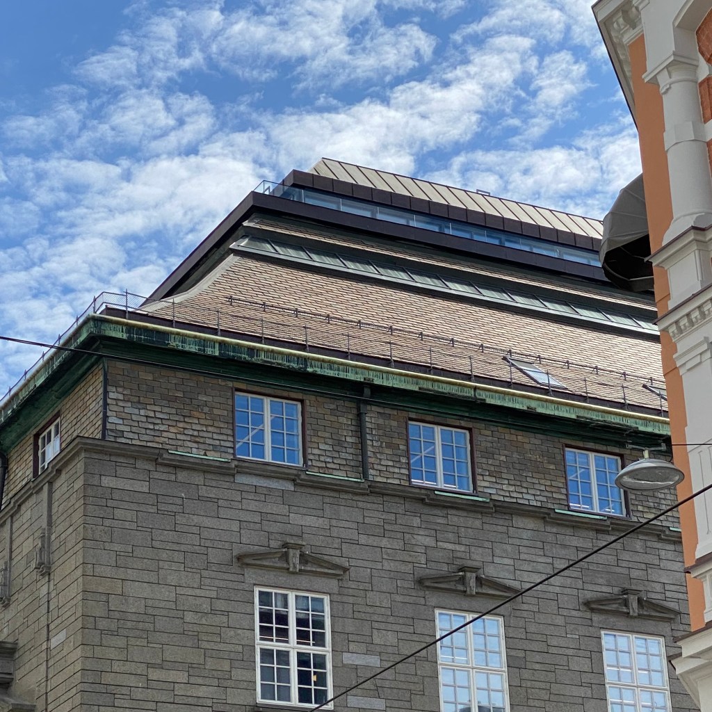 Pressens hus i Skippergata 24. Her er flere bygninger bygget sammen til en velfungerende enhet rundt en overglasset bakgård, men samtidig slik at de opprinnelige bygningsvolumene fortsatt «kan leses» . Et svært dypt lagerbygg med lav takhøyde var en hovedutfordring. Her ble løsningen å åpne bygningen i midten for å få lys ned. Samtidig ble den verneverdige jernkonstruksjonen flott eksponert i husets hovedrom. Trematerialer har fått en fremtredende plass i anlegget. Anlegget bærer preg av høy kvalitet i gjennomføringen.de samarbeidsprosesser.